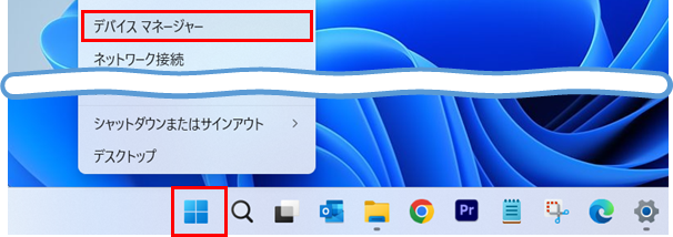 スタートメニューを右クリックし、「デバイスマネージャー」をクリックします。
