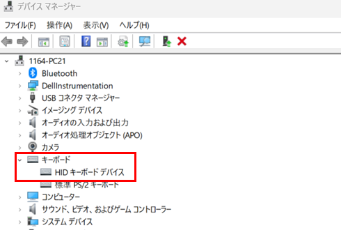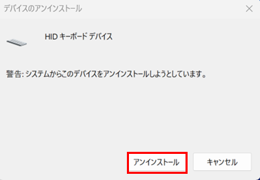「キーボード」をクリックして、展開します。「HIDキーボードデバイス」を右クリックします。「デバイスのアンインストール」をクリックします。