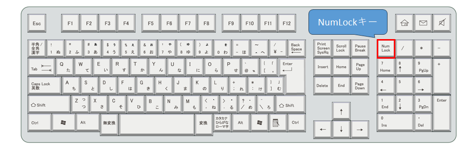 NumLockとは、テンキーを有効・無効を切り替えるボタンです。これがオンになっていると、入力ができないという事象が起きます。