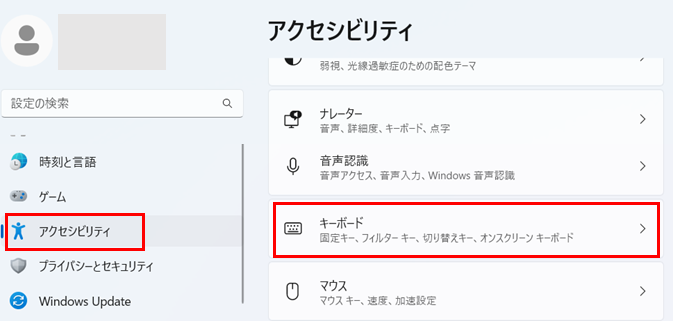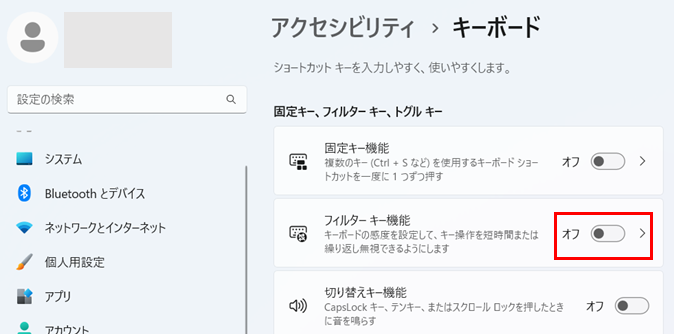 フィルターキーとは、手の震えなどの理由で、連続してキーを入力されてしまうのを抑える機能です。実際にオンにすると、キーを少し長めに押すことで入力することができます。